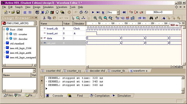 You can perform either a single step simulation, which is useful for source code debugging, or a continues simulation. Finish simulation by selecting the End Simulation option in the Simulatior menu. Save your waveform before exit. ![]() Manual Simulation Result