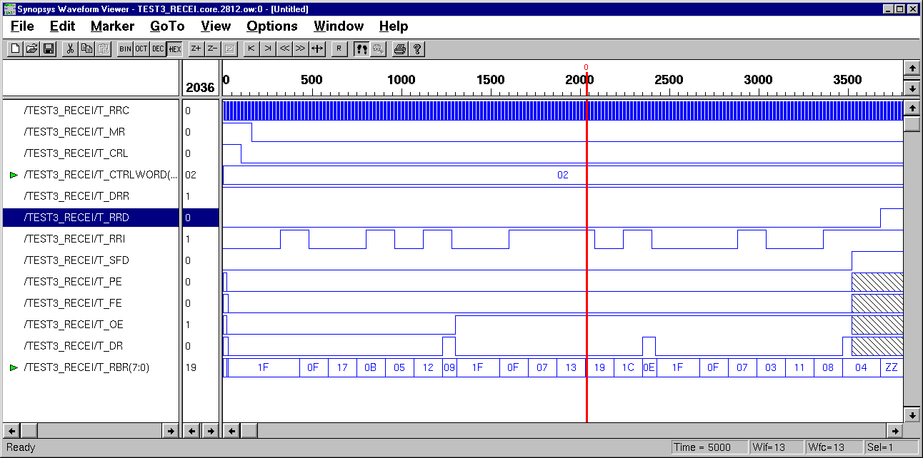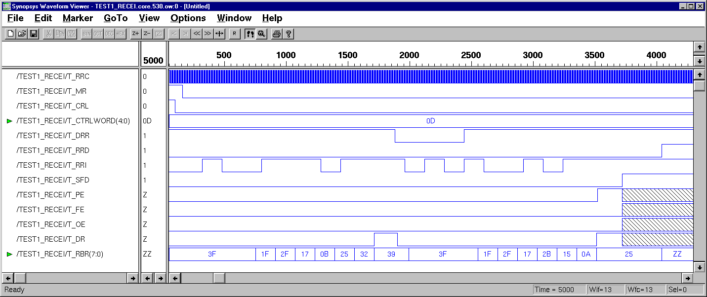 1 start, 1 stop, and no parity, (Data=01001 & 01110 & 00100, Control