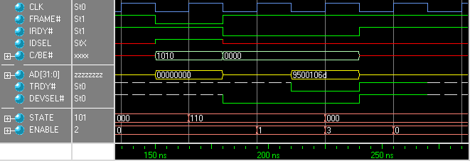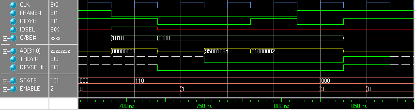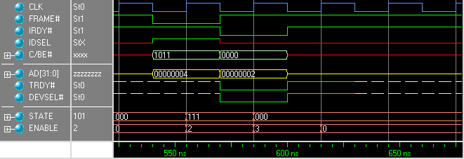 The target also handles fast back-to-back transactions (where the next address phase happens immediately when DEVSEL# is de-asserted) and longer bursts.