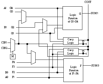 Each CLB F and G function generator contains dedicated arithmetic logic for the fast generation of carry and borrow signals. This extra output is passed on to the next CLB function generator above or below. The carry chain is independent of normal routing resources. Dedicated fast carry logic greatly increases the efficiency and performance of adders, subtracters, accumulators, comparators and counters (Figure 2).The two 4-input function generators can be configured as a 2-bit adder with built-in hidden carry that can be expanded to any length. This dedicated carry circuitry is so fast and efficient that conventional speed-up methods like carry generate/propagate are meaningless even at the 16-bit level, and of marginal benefit at the 32-bit level.