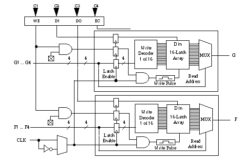Figure 1. Each CLB contains a pair of flip-flops and two independent 4-input function generators. These function generators have a good deal of flexabilty as most combinatorial logic functions need less than four inputs. Thirteen CLB inputs and four CLB outputs provide access to the functional flip-flops. Configurable Logic Blocks implement most of the logic in an FPGA. The principal CLB elements are shown in Figure 1. Two 4-input function generators (F and G) offer unre-stricted versatility. Most combinatorial logic functions need four or fewer inputs. However, a third function generator (H) is provided. The H function generator has three inputs. One or both of these inputs can be the outputs of F and G; the other input(s) are from outside the CLB. The CLB can therefore implement certain functions of up to nine variables, like parity check or expandable-identity comparison of two sets of four inputs.