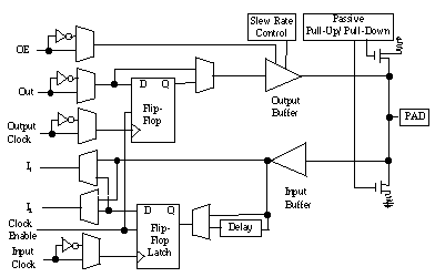 The two global adjustments of input threshold and output level are independent of each other. There is a slight hysteresis of about 300mV.Seperate clock signals are provided for the input and output registers; these clocks can be inverted, generating either falling-edge or rising-edge triggered flip-flops. As is the case with the CLB registers, a global set/reset signal can be used to set or clear the input and output registers whenever the RESET net is alive.