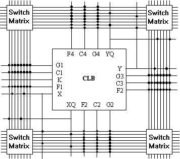 The function generator and control inputs to the CLB (F1-F4, G1-G4, and C1-C4) can be driven from any adjacent single-length line segment. The CLB clock (K) input can be driven from one-half of the adjacent single-length lines. Each CLB output can drive several of the single-length lines, with connections to both the horizontal and vertical Longlines.