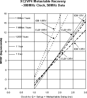The circuit of Figure 1 was implemented in an XC2VPro4 device using 0.13 micron, 9-layer-metal technology. Two different implementations put QA, the flip-flop under test first, into a CLB and then into an IOB. The results are listed in Table 1 and are plotted in Figure 2. Note that the time plotted on the horizontal axis includes the clock-to-out delay of QA, plus a short interconnect delay, plus the set-up time at the input of the QC flip-flop. The extrapolated results are outstanding, far superior to any metastable data published before. When granted two nanoseconds of extra settling delay, the problems caused by metastability are almost eliminated, as the MTBF exceeds millions of years.