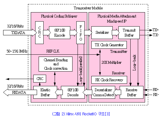(±×¸² 2)´Â Xilinx »çÀÇ ´ÙÁß ±â°¡ºñÆ® Æ®·£½Ã¹öÀÎ RocketIOÀÇ ±¸Á¶ÀÌ´Ù. SerDes°¡ ³»ÀåµÈ FPGA µð¹ÙÀ̽ºµéÀÇ SerDes ±¸Á¶´Â ¼·Î Á¶±Ý¾¿ Â÷À̰¡ ³ªÁö¸¸ ´ëºÎºÐ ºñ½ÁÇÑ ±â´ÉµéÀ» ³»ÀåÇϰí ÀÖ´Ù.