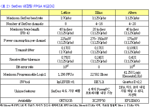 »ç¿ëÀÚ°¡ ¾î¶² Ãø¸éÀ» ´õ Áß¿ä½Ã ÇÒ °ÍÀΰ¡¿¡ µû¶ó¼ °¢°¢ÀÇ µð¹ÙÀ̽º ¼±Åà ±âÁØÀÌ µÉ °ÍÀÌ´Ù. Å« ÇÁ·Î±×·¡¸Óºí ¿µ¿ªÀÌ ÇÊ¿ä ¾ø´Â XAUI, Fibre Channel ¾ÖÇø®ÄÉÀ̼ǿ¡´Â Lattice Á¦Ç°ÀÌ °¡Àå Å« ÀÌÁ¡ÀÌ ÀÖ´Ù. Ç÷§Æû ±â¹ÝÀÇ FPGA ±¸ÇöÀÇ °Á¡À» °¡Áö´Â Xilinx Á¦Ç°Àº ÀÓº£µðµå ÇÁ·Î¼¼¼ ÄÚ¾î¿Í ´Ù¾çÇÑ IP, °Å±â¿¡ °í¼Ó Á÷·Ä¹ö½º ÀÎÅÍÆäÀ̽º¸¦ ±¸ÇöÇÒ ¼ö Àִ ȯ°æÀ» Á¦°øÇÑ´Ù. SerDesÀÇ Çϵå¿þ¾îÀû ¼º´É Áï µå¶óÀÌºê ±æÀÌ, ÆÄ¿ö¼Òºñ, ÁöÅÍ¿¡ ¹Î°¨ÇÑ µðÀÚÀÎÀ̳ª SONET, SPI 4.2 Phase 2 °°Àº ÇÁ·ÎÅäÄÝÀ» »ç¿ëÇÒ ¶§´Â Altera Á¦Ç°ÀÌ À¯¸®ÇÒ °ÍÀÌ´Ù. Âü°í·Î <Ç¥ 2>´Â SerDes ³»ÀåµÈ FPGA¿¡ ´ëÇÑ Ç׸ñº° ºÐ¼®Ç¥ÀÌ´Ù.
