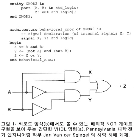 고맙게도 FPGA 회로를 설계하는 데 사용하는 툴 덕분에 엔지니어는 대부분의 세부 구현을 직접 하지 않아도 된다. 고수준 FPGA 설계 툴은 개별 기능에 대한 회로도 기호(schematic symbol)를 대신하기 위해 VHDL(그림 1) 및 Verilog 컴퓨터 언어를 사용하는 경우가 많다(이 기사의 온라인 버전에 있는 "FPGA Alphabet Soup" 참조). 하지만 처음 FPGA 회로를 만드는 디지털 디자이너라 해도 뭔가 새로운 것을 마스터할 필요는 없다.