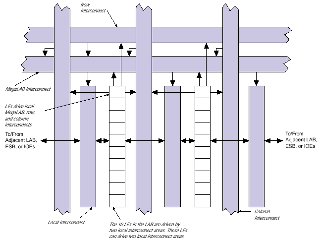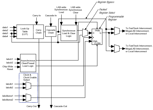 APEX¿¡ ±¸ÇöµÈ MegaLABÀº LAB (Logic Array Block) 16°³¿Í 2KbitÀÇ RAMÀ» ºí·ÏÈÇÑ °ÍÀ¸·Î °¢°¢ÀÇ LAB´Â LE (Logic Element) °¡ 160 °³¿¡ ´ÞÇÑ´Ù. ¾ËÅ×¶ó°¡ LE¶ó°í ºÎ¸£´Â ·ÎÁ÷´ÜÀ§´Â FPGAÀÇ ±âº» ±¸Á¶ÀÎ 4-ÀÎDz LUT (Look up Table) ¿Í Çø³ ÇÃ·Ó (Flip-Flop) À» °áÇÕÇÑ °ÍÀÌ´Ù. (±×¸² 1 ÂüÁ¶) ¾ËÅ×¶ó´Â Flex10K ½Ã¸®Á ºñ·ÔÇØ ÀÚ»çÀÇ FPGA¸¦ ±¸ÇöÇϴµ¥ ÀÖ¾î ÀÌ·¯ÇÑ LE¸¦ ºí·ÏÈÇÑ LAB ±¸Á¶¸¦ äÅÃÇϰí ÀÖ´Ù.