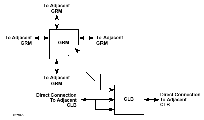 GRM (General Routing Matrix) À̶ó´Â ¶ó¿ìÆÃ¸¸ Àü´ãÇÏ´Â ½ºÀ§Äª ¸ÅÆ®¸¯½º¸¦ °¢ CLBÁß°£¿¡ ¼³Ä¡ CLB¿Í CLB°£ÀÇ Á÷Á¢ÀûÀÎ ¶ó¿ìÆÃÀ» ÇÏÁö ¾Ê°í Àü´ã ¸ÅÆ®¸¯½º¸¦ ÅëÇØ ¿¬°áÇϵµ·Ï ÇÏ¿´´Ù. (±×¸² 6 ÂüÁ¶)