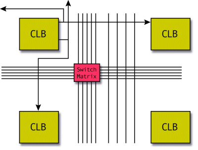 There are also short lines that are used to connect individual CLBs that are located physically close to each other. Transistors are used to turn on or off connections between different lines. There are also several programmable switch matrices in the FPGA to connect these long and short lines together in specific, flexible combinations.