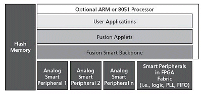A functional block diagram of an FPGA that includes an embedded processor core, embedded digital peripheral cores, and embedded analog cores is shown in Fig 6.