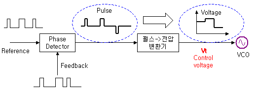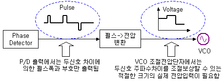 À§ÀÇ °æ¿ì P/D Ãâ·Â¿¡¼ 10MHzÀÇ Â÷ÀÌ¿¡ ÀÇÇÑ ÆÞ½º°¡ º¯È¯±â¿¡ µé¾î¿Â´Ù¸é, º¯È¯±â¿¡¼ 1.9V°¡ Ãâ·ÂµÇµµ·Ï ȸ·ÎÀûÀ¸·Î ±¸ÇöÇÒ ¼ö ÀÖ½À´Ï´Ù. ÀÚ¼¼ÇÑ È¸·Îµµ¸¦ ±×¸®±â¿£ º¹ÀâÇÏ´Ï±î »ý·«ÇÏÁö¸¸, ¾î·°Å³ª ¿øÇÏ´ø Á֯ļö¿Í Ãâ·Â Á֯ļö¿ÍÀÇ Â÷À̰¡ ¹ß»ýÇØ ¹ö¸®¸é, ±× Â÷ÀÌ¿¡ ÇØ´çÇÏ´Â ÆÞ½º°ªÀ» Àû´çÈ÷ Á¶ÀýÇÏ¿© º¸Á¤°¡´ÉÇÑ Àü¾ÐÃâ·Â(=VCOÁ¶ÀýÀÔ·Â)À¸·Î º¯È¯ÇÒ ¼ö ÀÖ°í, ±×°ÍÀ¸·Î¼ VCOÀÇ Ãâ·Â Á֯ļö¸¦ ¾ïÁö·Î ¿øÇÏ´Â °ªÀ¸·Î µ¹·Á³õÀ» ¼ö ÀÖ´Ù´Â Á¡, À̰ÍÀÌ ÇÙ½ÉÀÔ´Ï´Ù!