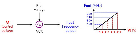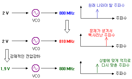À§ÀÇ ±×¸²¿¡¼ ó·³, VCOÀÇ Àü¾ÐÁ¶Àý´ÜÀÚ¿¡ ¾î¶² Àü¾ÐÀÌ µé¾î°¡´À³Ä¿¡ µû¶ó Ãâ·Â Á֯ļö°¡ ¹Ù²ò´Ï´Ù. ¸¸¾à ¿©±â¼ 2V°¡ µé¾î°¡¸é 800MHz°¡ ³ª¿À°í, 2.1V°¡ ³ª¿À¸é 810MHz°¡ ³ª¿Â´Ù°í °¡Á¤Çغ¸Áö¿ä. ´õ¿í ½¬¿î ÀÌÇØ¸¦ µ½±â À§ÇØ °¡»óÀÇ Ç¥·Î ¸¸µé¾î º¸¾Ò½À´Ï´Ù.