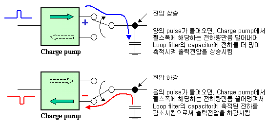 ¨ë Charge Pump (C/P) P/D¿¡¼ ³ª¿Â ÆÞ½ºÆø¿¡ ºñ·ÊÇÏ´Â Àü·ù¸¦ ÆÞ½º ºÎÈ£¿¡ µû¶ó ¹Ð°Å³ª ´ó°ÜÁØ´Ù. ÆÞ½º¸¦ Àü·ù·Î º¯È¯ÇØÁÖ´Â °úÁ¤¿¡¼ Àü·ùÀ̵æ(Icp)°¡ Á¸ÀçÇϰí, ÀÌ ¾çÀº lock timeÀ» ºñ·ÔÇÑ PLLÀÇ ¼º´É¿¡µµ Å« ¿µÇâÀ» ÁØ´Ù. PLL IC¿¡ µû¶ó¼´Â Icp °ªÀ» Á¶Á¤ÇÒ ¼öµµ ÀÖ´Ù.