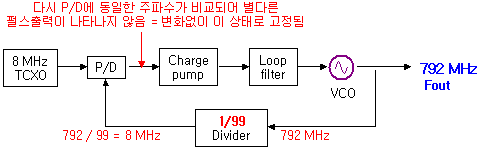 ¿ÀÈ£¶ó - Ãâ·Â¿¡¼ ³ª¿Â 792 MHz°¡ divider¸¦ °ÅÄ¡¸é¼ 99·Î ³ª´µ¸é °á±¹ 8MHzÀÇ Ãâ·ÂÀÌ ³ª¿Í ¹ö¸®°Ô µÇ´Â±º¿ä. ±×·¸´Ù¸é P/D¿¡¼ ´Ù½Ã ¶È°°Àº Á֯ļö¸¦ ºñ±³ÇÏ°Ô µÇ¾î º°´Ù¸¥ ÆÞ½º¸¦ ³»º¸³»Áö ¾Ê°Ô µÇ°í, charge pumpÀÇ »óŸ¦ ±×»óÅ¿¡¼ ¾ÈÁ¤È½ÃÄѹö¸³´Ï´Ù. ±×·¸°Ô µÇ¸é °á±¹ ÀÌ ½Ã½ºÅÛÀº? 792 MHz¶ó´Â ÀüÇô ´Ù¸¥ Á֯ļö¿¡¼ ¾ÈÁ¤ÈµÇ¾î¹ö¸³´Ï´Ù. ¿©±â¼´Â ¿¹´Ï±î ´Ü¼øÇÏ°Ô Ç¥ÇöÇßÁö¸¸.. ½ÇÁ¦·Î Çö´ëÀû À̵¿Åë½Å¿¡¼´Â Àú divider ºÎºÐÀÌ °¡Àå º¹ÀâÇÕ´Ï´Ù. Àý¹¦ÇÑ ºñÀ²º¯È·Î Á֯ļö¸¦ ¹Ù²Ù¾î¾ß Çϱ⠶§¹®¿¡ ´Ù´Ü°è ´ÙÁß°æ·Î·Î Ãâ·ÂÁ֯ļö¸¦ ºÐÁÖÇϸç, ¼ÒÀ§ PLL IC¶ó ºÒ¸®¿ì´Â ³ðµéÀ» ÅëÇØ S/WÀûÀ¸·Î ºÐÁÖºñ¸¦ ¹Ù²Ù¸é¼ ÃÖÁ¾ÀûÀ¸·Î ³ª¿À´Â Ãâ·ÂÁ֯ļö¸¦ ¹Ù²Ü ¼ö ÀÖ°Ô µÇ¾î ÀÖ½À´Ï´Ù.