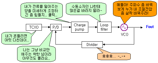 ÀÌ·± ±âÁØÁ֯ļö(reference frequency)·Î ÁÖ·Î ¾Ö¿ëµÇ´Â °ÍÀÌ ¹Ù·Î TCXO (Temperature Compensated X-tal Oscillator : ¿Âµµº¸»ó¼öÁ¤¹ßÁø±â)ÀÔ´Ï´Ù. ¿ÜºÎ ¿Âµµ¿¡ ¿µÇâÀ» °ÅÀÇ ¹ÞÁö ¾ÊÀ¸¸é¼µµ ¿øÇÏ´Â Ãâ·Â Á֯ļö¸¦ ¸Å¿ì ¾ÈÁ¤ÀûÀ¸·Î À¯ÁöÇÒ ¼ö ÀÖ´Â °íǰÁúÀÇ ¹ßÁø±âÀÔ´Ï´Ù. ÀÌ·± TCXO¸¦ ±×´ë·Î 800MHz´ë¿ª¿¡¼ ¾µ ¼ö ÀÖ´Ù¸é ÁÁ°ÚÁö¸¸, ¾Ö¼®ÇϰԵµ ÀÌ·± °í¾ÈÁ¤ ¹ßÁø±â´Â ¼ö½ÊMHz ±îÁö°¡ ÇѰèÀÔ´Ï´Ù. °á±¹ ±×·¡¼ »ý±ä°Ô PLL À̶ó°í º¼ ¼öµµ ÀÖ´Â °ÍÀÌÁö¿ä. ¿©±â¼ µÎ°¡Áö¸¸ Àß Â¤¾îº¸°í ³Ñ¾î°¡¸é ºÐÁÖ±â(divider)ºÎºÐÀÌ ´õ ¸íÈ®È÷ ÀÌÇØ°¥ °ÍÀÔ´Ï´Ù.